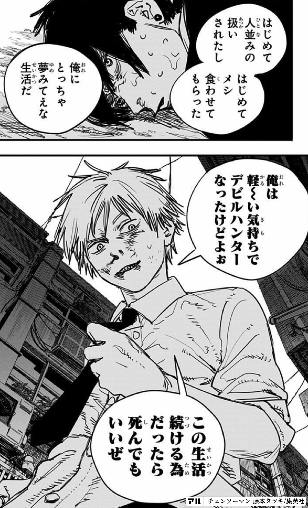 はじめて人並みの扱いされたし はじめてメシ食わせてもらった 俺にとっちゃ夢みてえな生活だ 俺は軽 い気持ちでデビルハンターなったけどよぉ この生活続ける為だったら死んでもいいぜ チェンソーマン アル